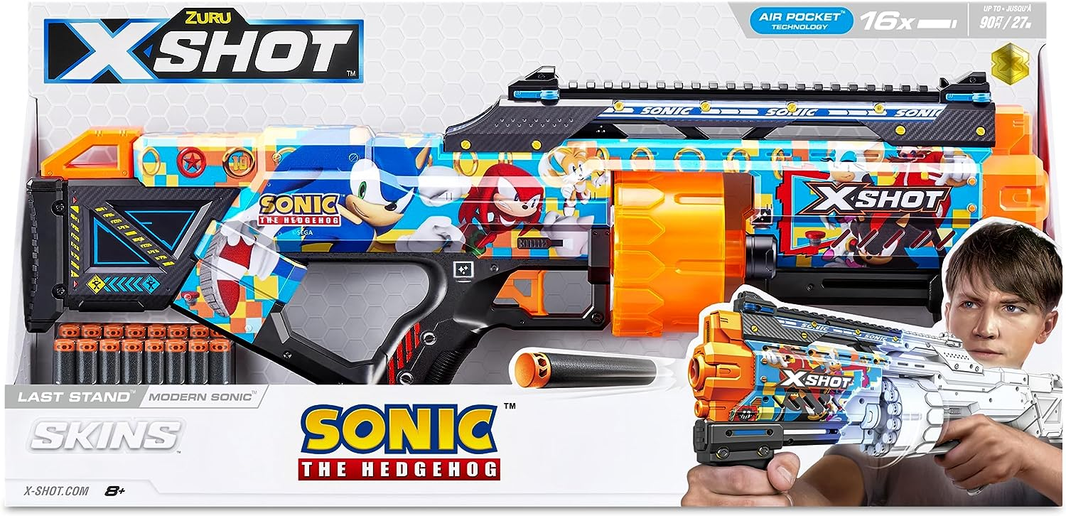 X-Shot, a brand renowned for producing a diverse range of toy blasters that shoot foam darts or water, has recently unveiled a fresh “Modern Sonic” skin for their “Last Stand” line of blasters. This blaster boasts a 14-dart capacity, the ability to hit multiple targets at distances of up to 27m/90 feet, and features “Slam Fire action”.