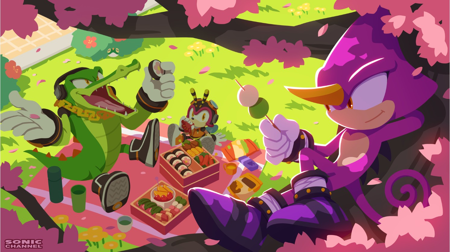 First revealed at the Korean Sonic Fan Meeting, Sonic Channel has released this month’s Sonic Pict, featuring Team Chaotix enjoying a picnic while admiring the blossoming cherry trees.