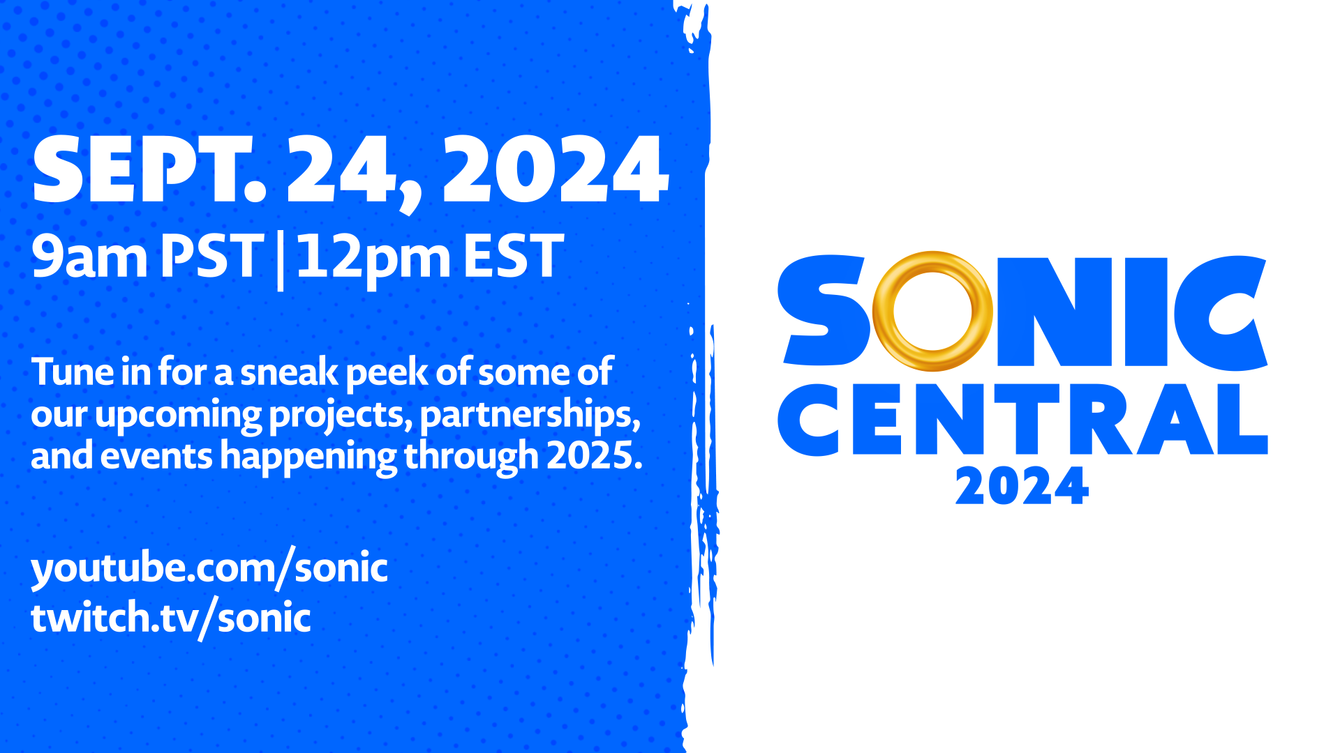 Today, SEGA of America announced the company’s fourth annual Sonic the Hedgehog virtual event, Sonic Central, will take place tomorrow, Tuesday, September 24 at 12pm ET / 9am PT. Sonic fans can tune into Sonic Central on the official Sonic the Hedgehog YouTube and Twitch channels to learn about a slew of exciting upcoming projects featuring the iconic Blue Blur.