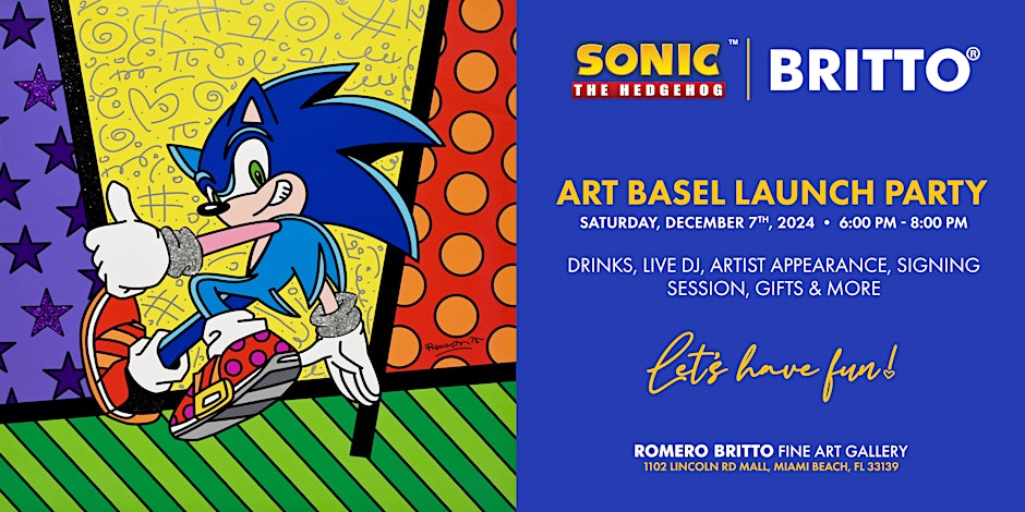 The collaboration kicks off with an exclusive pop-up event at Britto’s flagship gallery in Miami, Florida, on Saturday, December 7, 2024. Located at the Romero Britto Gallery at 1102 Lincoln Rd, Miami Beach, FL, the event runs from 6–8 PM EST, offering a unique, Sonic-themed experience.