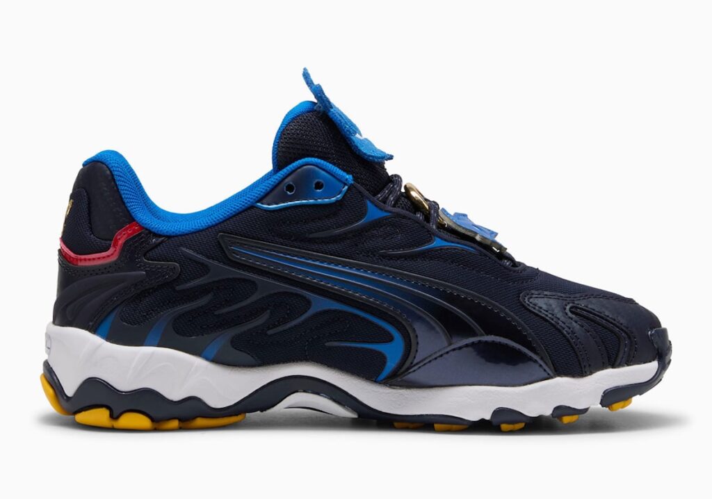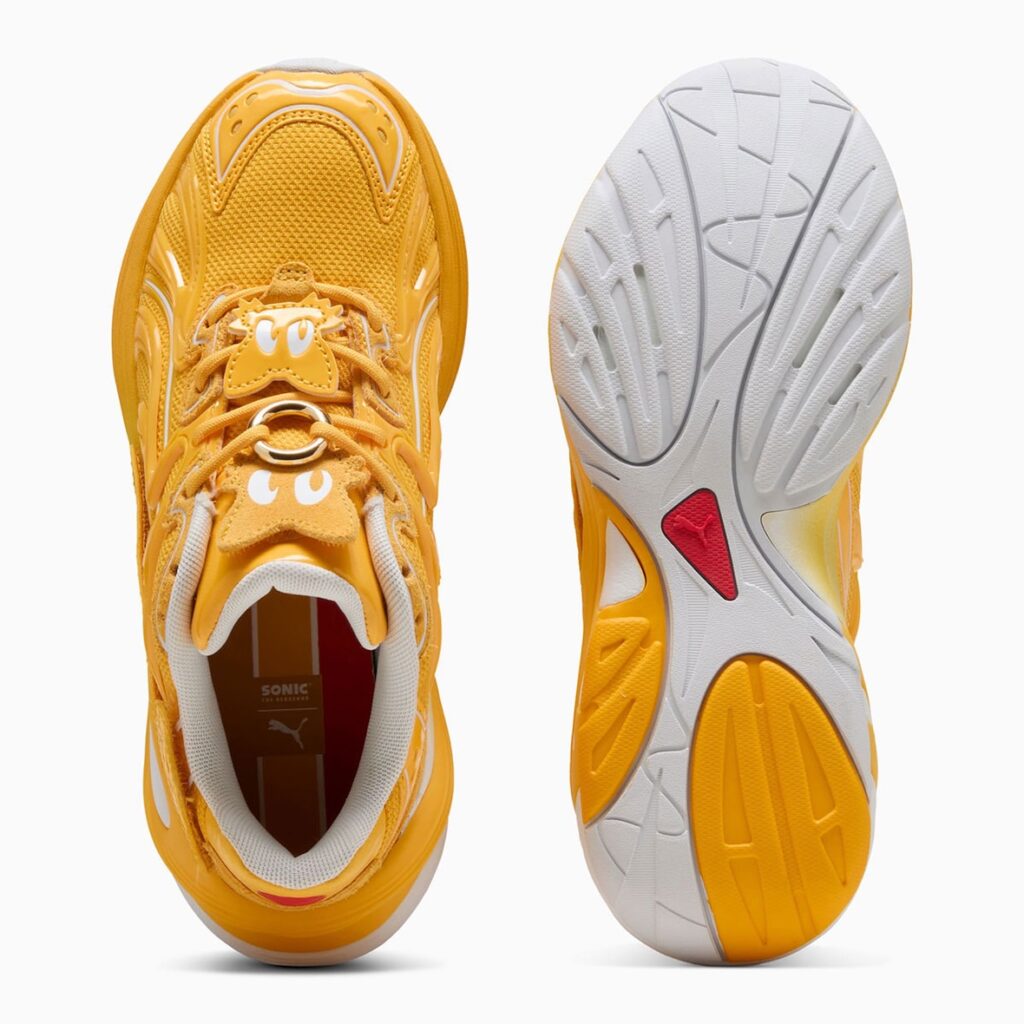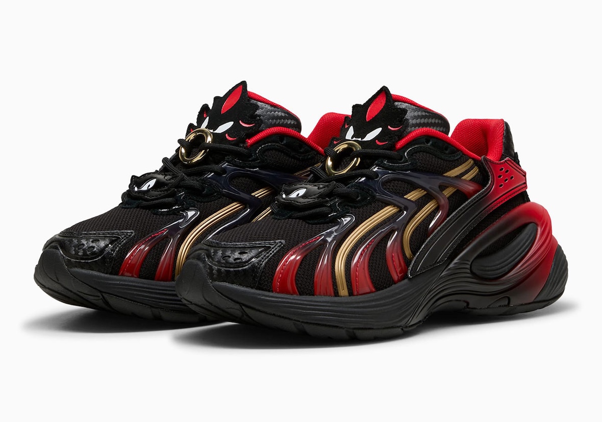 The PUMA Inhale “Sonic” reimagines the early 2000s model with vibrant blue mesh inspired by Sonic, accented with red, silver, and yellow, and finished with a Sonic graphic on the insole. The PUMA Inverse Chrome “Tails” shines with gold and chrome panels, bright white and orange accents, and a custom fox tail PUMA logo. The PUMA Inverse Chrome “Shadow” delivers a darker look with black uppers and striking red chrome touches that call back to Shadow’s hover shoes and eyes.