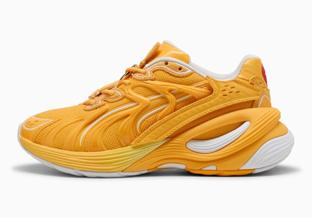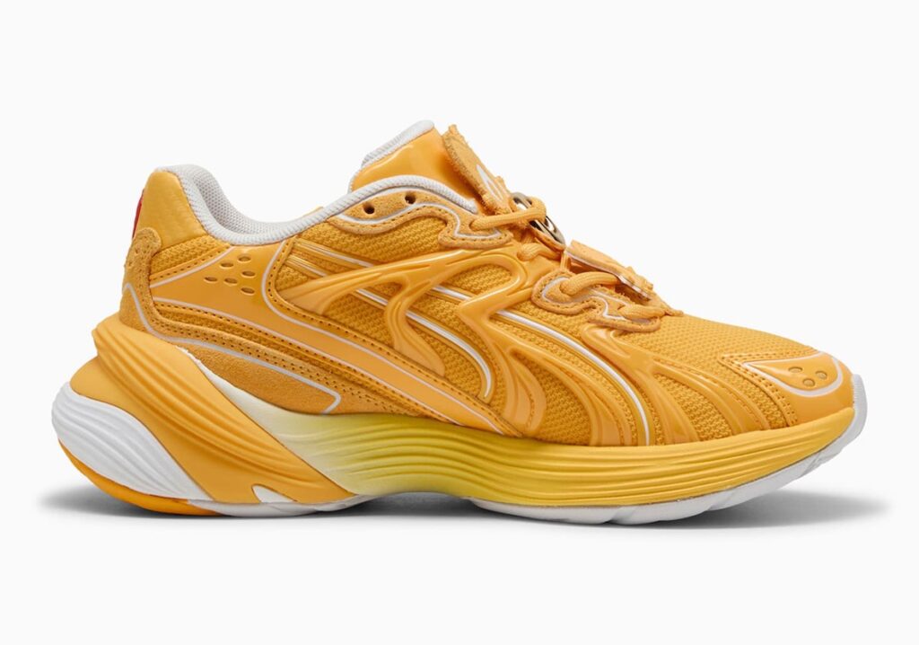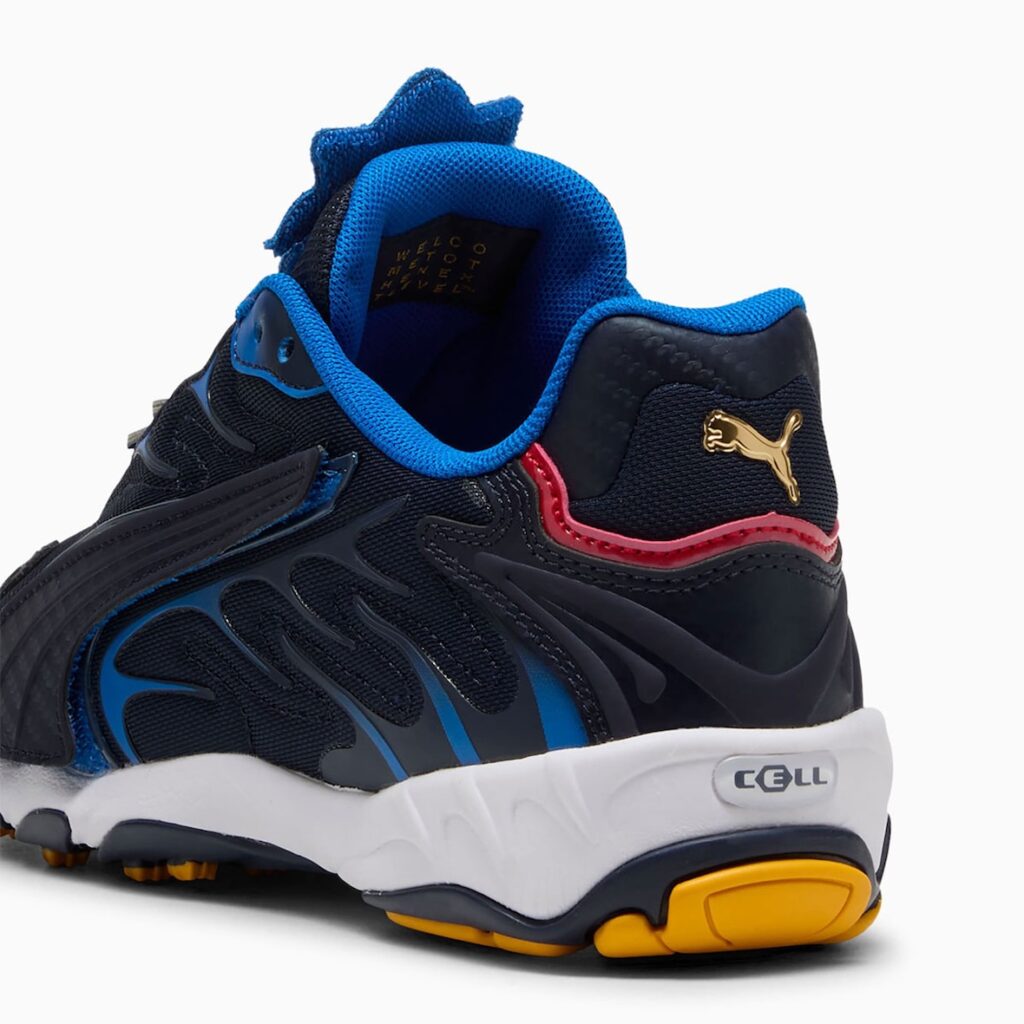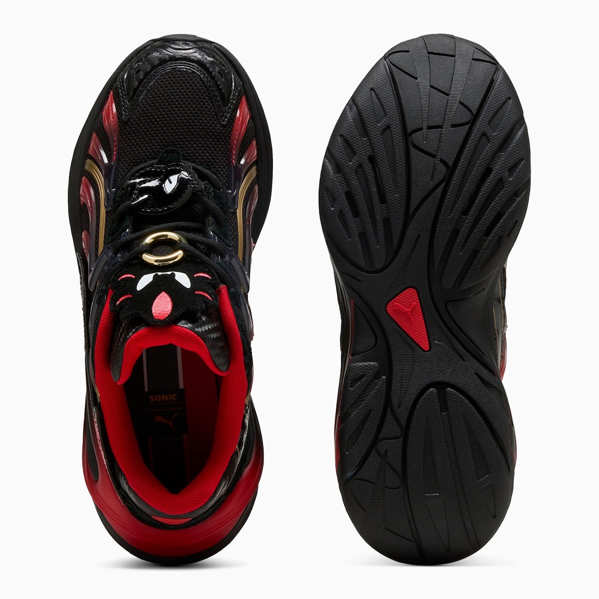The PUMA Inhale “Sonic” reimagines the early 2000s model with vibrant blue mesh inspired by Sonic, accented with red, silver, and yellow, and finished with a Sonic graphic on the insole. The PUMA Inverse Chrome “Tails” shines with gold and chrome panels, bright white and orange accents, and a custom fox tail PUMA logo. The PUMA Inverse Chrome “Shadow” delivers a darker look with black uppers and striking red chrome touches that call back to Shadow’s hover shoes and eyes.