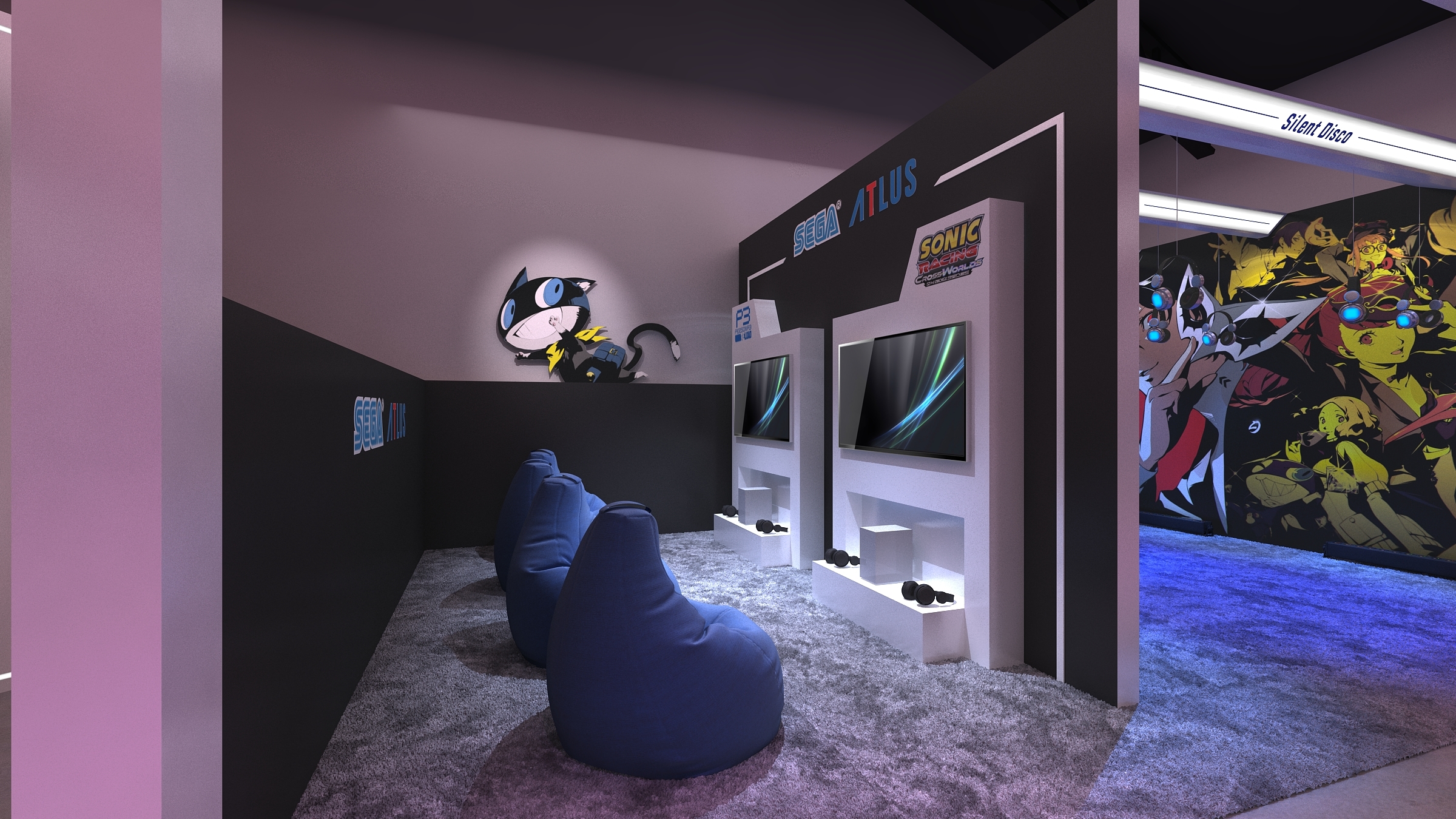 Visitors to the SEGA/Atlus booth can enjoy themed areas including the Silent Disco Area, which blends Sonic and Persona photo spots with music listening stations, and the Game Trial Area, styled as a cozy room where fans can try upcoming titles. Featured games include Sonic Racing: CrossWorlds (PS5, launching September 25) and Persona 3 Reload (Nintendo Switch 2, launching October 23).