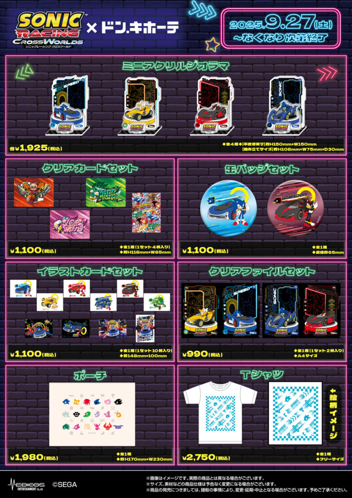 At participating Don Quijote stores, fans will be able to pick up a lineup of original Sonic Racing: CrossWorlds goods, including acrylic dioramas, clear files, T-shirts, and more, all featuring official artwork and characters from the game.
