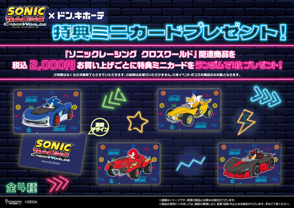 Shoppers will also receive a bonus mini card (1 of 4 types) for every ¥2,000 spent on Sonic Racing: CrossWorlds goods, while supplies last.