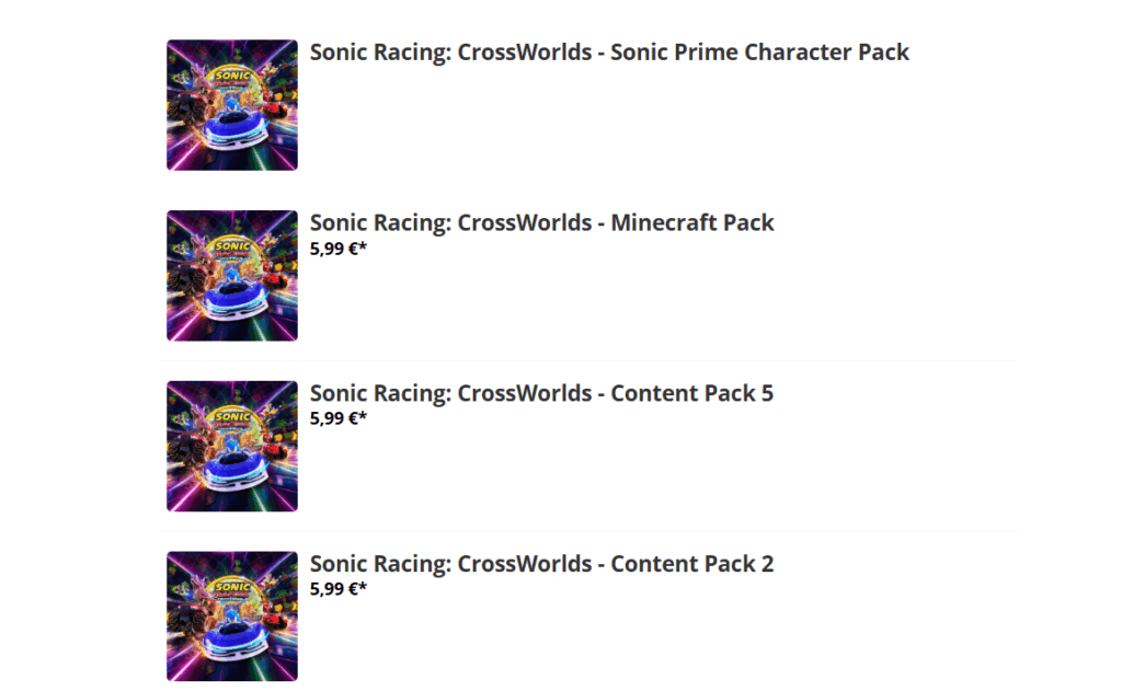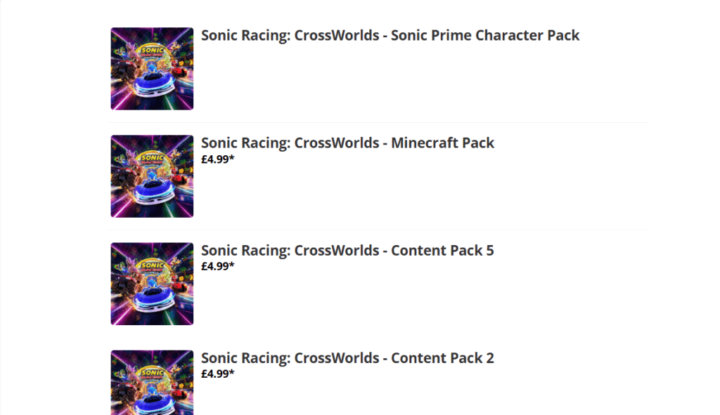 The price of each DLC pack for Sonic Racing: CrossWorlds has been revealed through new listings on the European Nintendo eShop. While SEGA has not yet confirmed whether the packs can be purchased individually, the eShop shows each one priced at £4.99/€5.99.