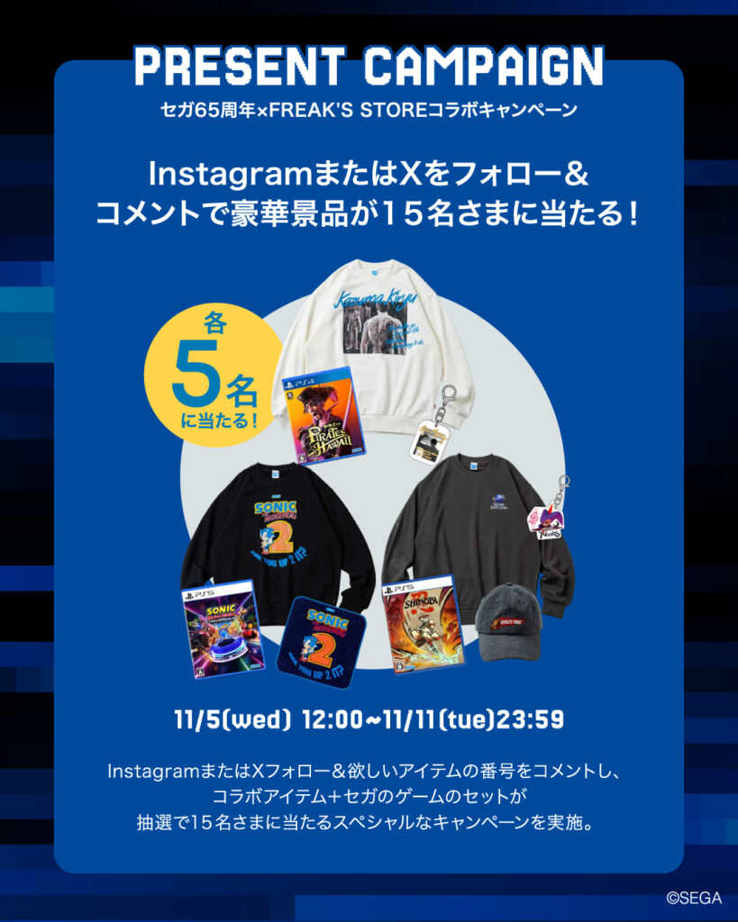 To enter, participants must follow the official FREAK’S STORE and SEGA accounts on Instagram or X (Twitter) and comment or repost their desired item number on the campaign post between November 5 and November 11. Winners will be notified via direct message later in November.