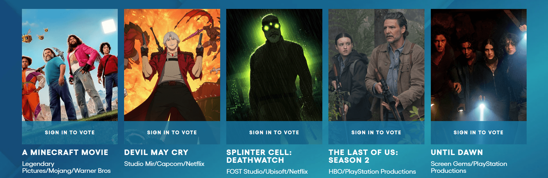 As for who might win, that remains unpredictable. Splinter Cell Deathwatch seems to have upset the fewest people, which may help it stand out. The Last of Us Season Two still carries significant name recognition due to its cast and earlier success. A Minecraft Movie could also gain momentum if its massive audience decides to rally behind it.