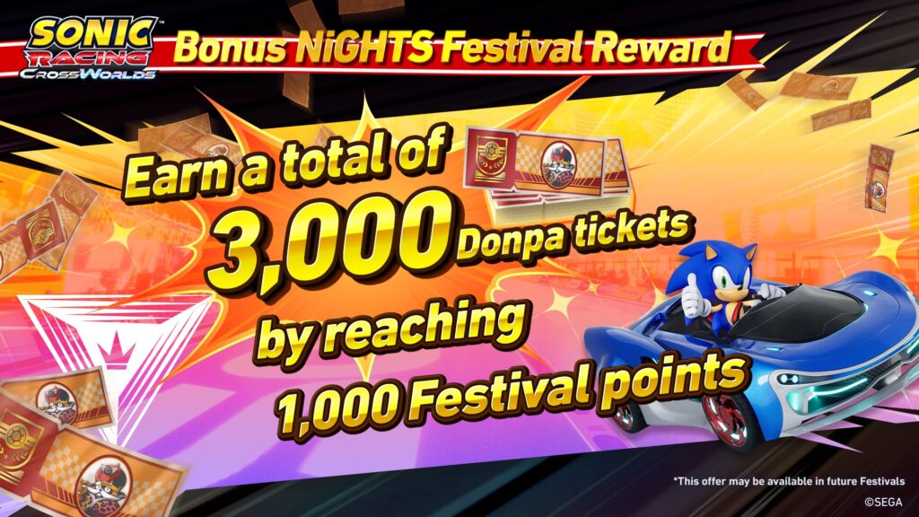 During the NiGHTS Festival, players can earn Donpa Tickets by collecting Festival points through normal gameplay. Racers who reach 1,000 Festival points can earn up to 3,000 Donpa Tickets in total, making this event a great chance to build up resources while enjoying the seasonal atmosphere.