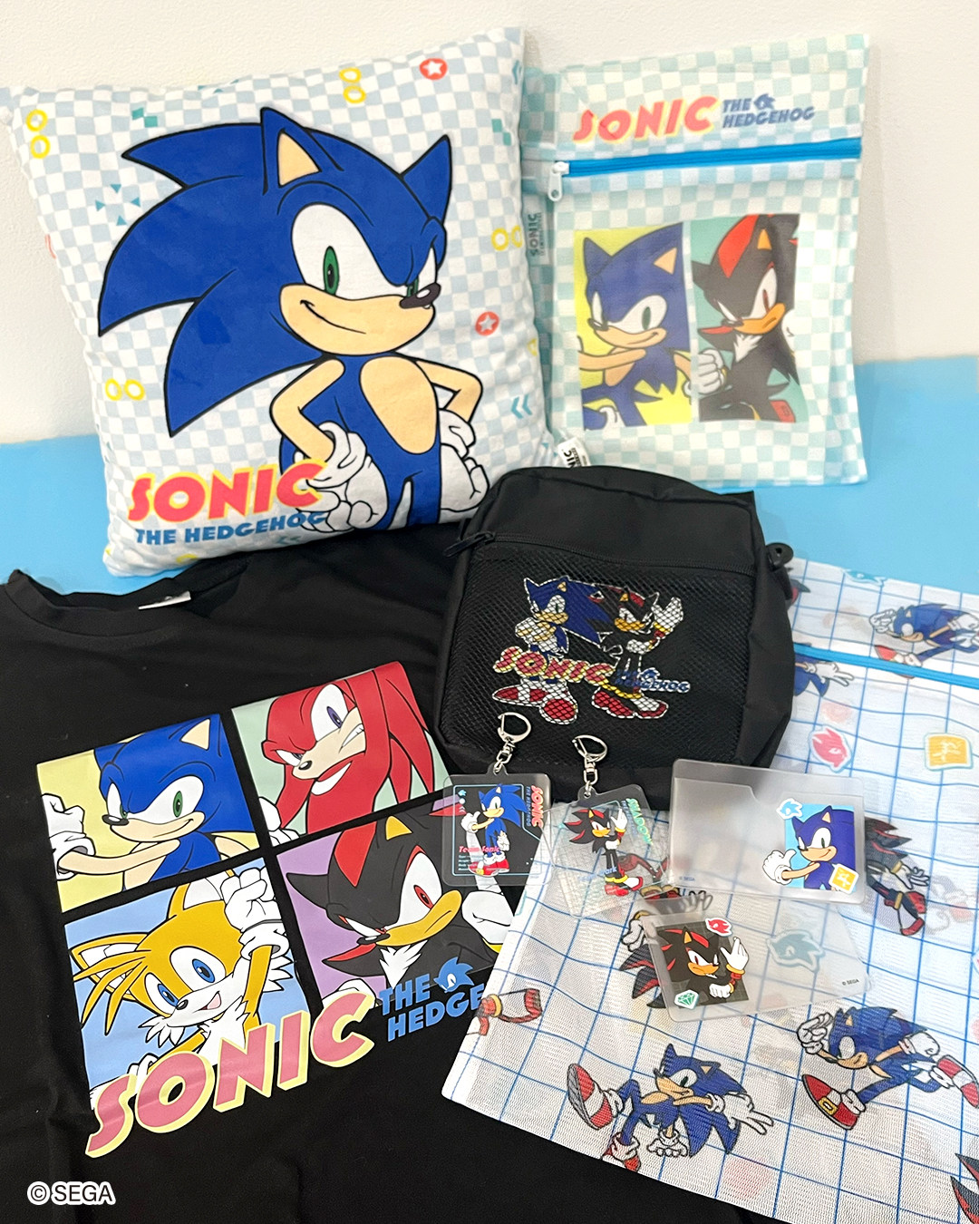 The lineup mixes collectible items with everyday fashion pieces. Fans can expect character profile style acrylic keychains, clear holographic stickers, and face cover cases designed for ID cards or commuter passes. Wearable items such as T shirts and shoulder bags are also included, making it easy to work Sonic and Shadow into everyday outfits.