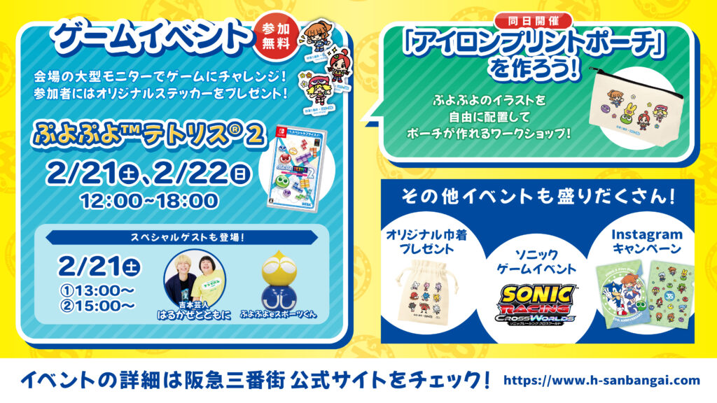 At the commercial complex Hankyu Sanbangai in Umeda, Osaka, a major collaboration event titled “Soni × Puyo Festival in Hankyu Sanbangai” will run from February 1 through March 31, 2026, celebrating the 35th anniversaries of Sonic the Hedgehog and Puyo Puyo.