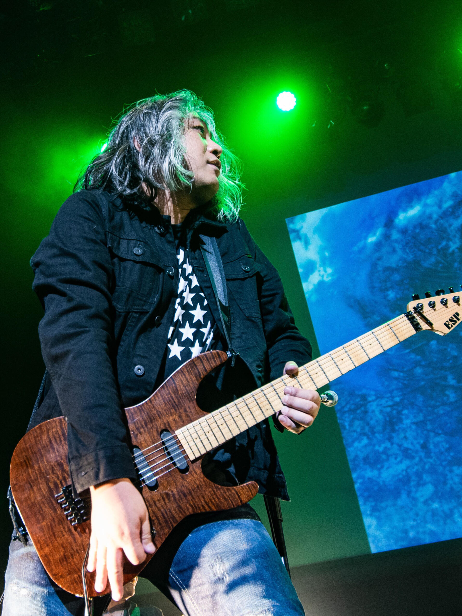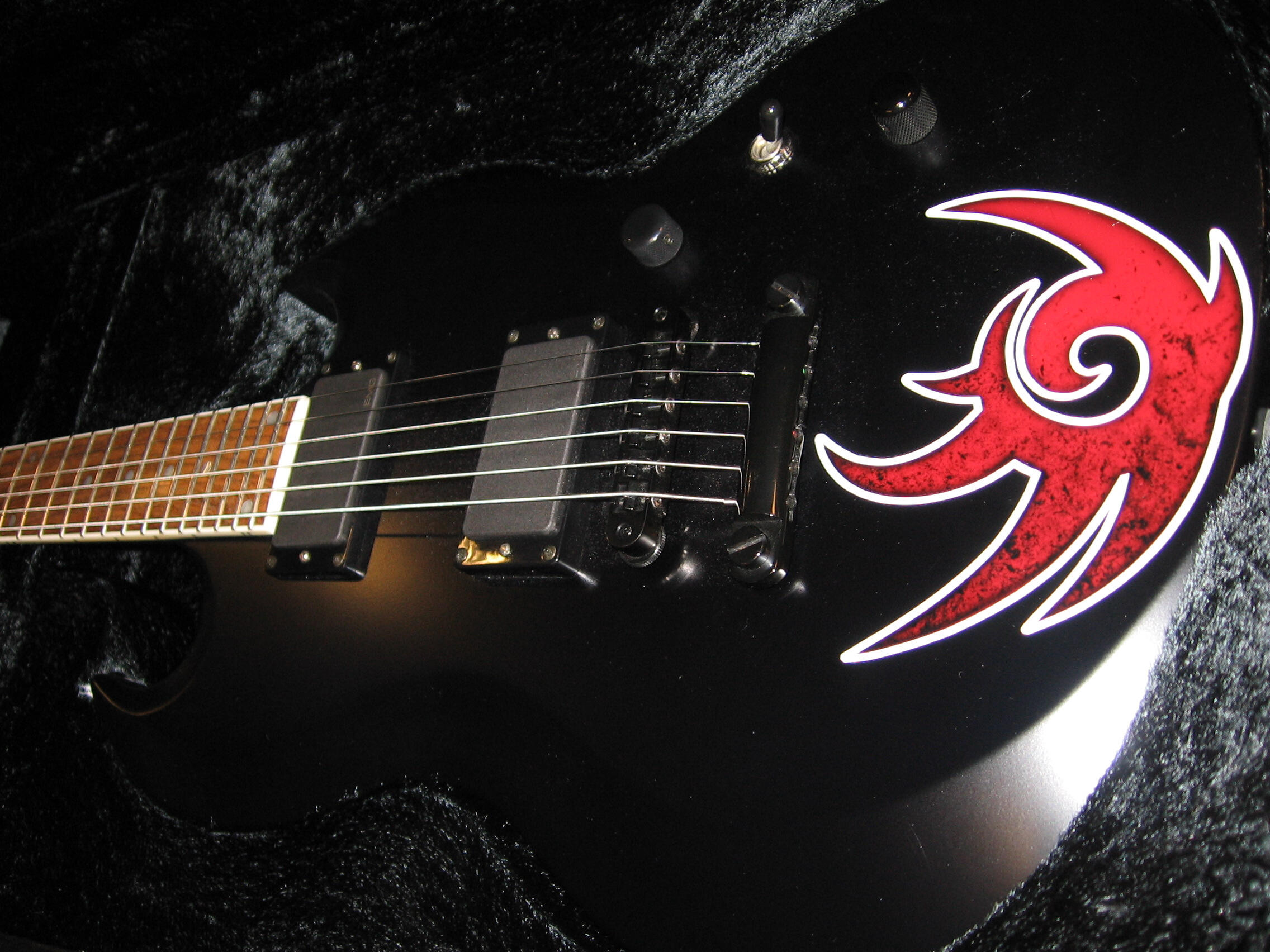 Several of Senoue’s guitars were built as direct extensions of Sonic’s world. His black ESP “SONIC” guitar, first unveiled during the Sonic Adventure era, features Sonic’s eye and grin on the body and has been used live for many of the franchise’s most recognizable songs. An ESP Viper themed around Shadow the Hedgehog was tuned specifically for heavier material and used primarily for “I Am… All of Me” and “With Me.” For Sonic and the Black Knight, ESP produced a custom “Black Knight” guitar featuring artwork from the game itself, which Senoue debuted publicly at Tokyo Game Show in 2008 while performing “Knight of the Wind.”