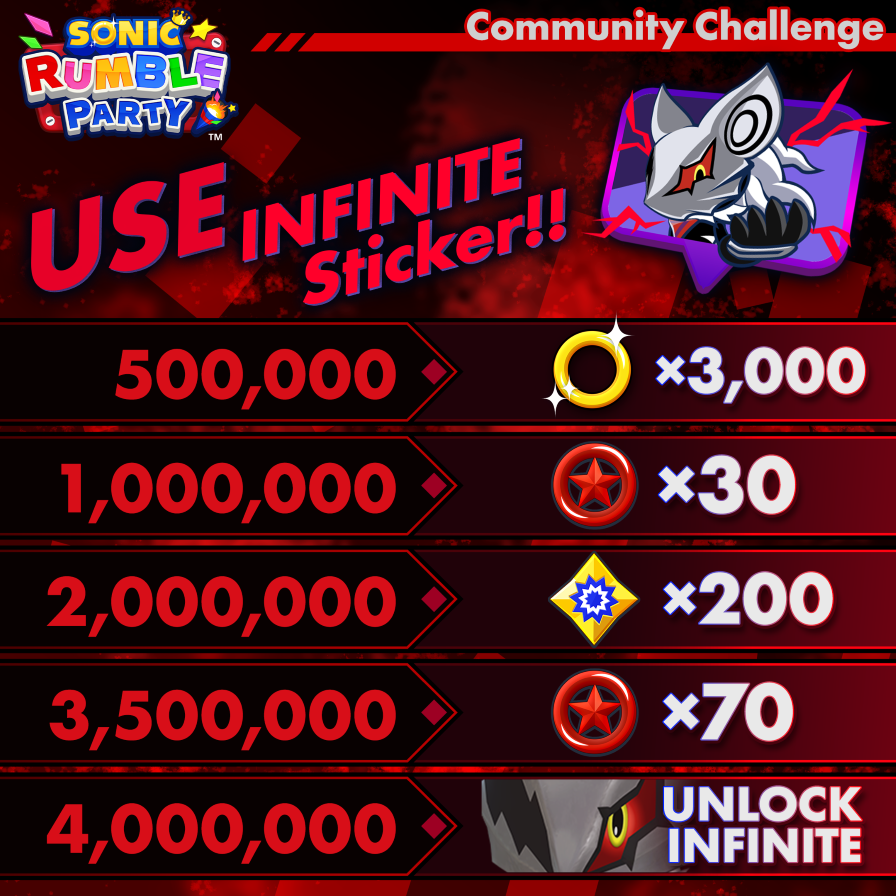 During the Community Challenge, SEGA will count the total number of times all players use the distributed “Taunt (Infinite)” stamp. Rewards will then be handed out based on the combined global total. Players are encouraged to check the official Sonic Rumble Party Discord and official X account for challenge details and live progress updates.