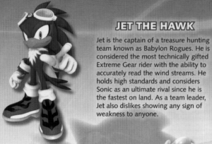 Jet made his debut in Sonic Riders, where he led the Babylon Rogues into the EX World Grand Prix after Dr. Eggman hired them to challenge Sonic and his friends while collecting the Chaos Emeralds for him. In truth, Eggman intended to use the competition and the Rogues to uncover the secrets of Babylon Garden and claim its treasure for himself.[14]Sonic Riders As leader, Jet carried the ancient control box that had been passed down through generations of Babylon Rogue leaders, tying him directly to that inheritance.[15]Sonic Riders. . UK instruction booklet. p. 7