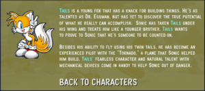 - ↑ a b . Miles "Tails" Prower. Sonic Characters. . Archived version. “Tails is a young fox that has a knack for building things. He's as talented as Dr. Eggman, but has yet to discover the true potential of what he really can accomplish. Sonic has taken Tails under his wing and treats him like a younger brother. Tails wants to prove to Sonic that he's someone to be counted on. Besides his ability to fly using his twin tails, he has become an experienced pilot with the 'Tornado,' a plane that Sonic helped him build. Tails' fearless character and natural talent with mechanical devices come in handy to help Sonic out of danger.”