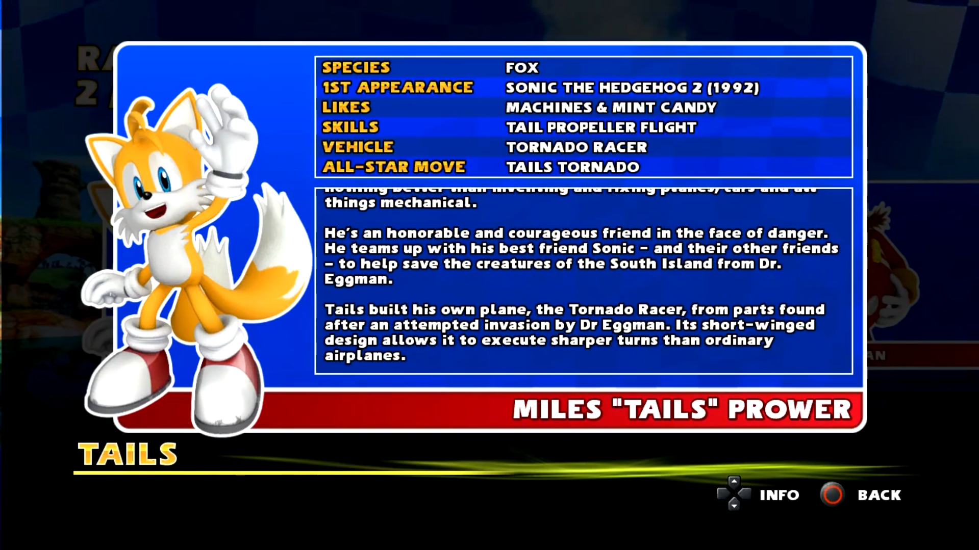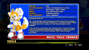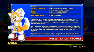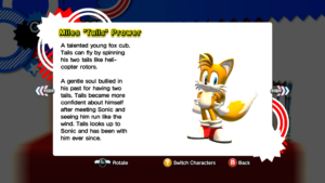 - ↑ a b Bandai Namco, Sora Ltd. (3 October 2014). Super Smash Bros. for Wii U. Wii U. Nintendo. Area/Level: Trophy Hoard. “Miles "Tails" Prower – This gentle-hearted little fox used to get bullied because of his two tails. Then one day he saw Sonic on West Side Island and decided to join him on his adventures. Now he’s an expert mechanic and a partner Sonic can really rely on— he’s come a long way since his timid, quiet beginnings!”