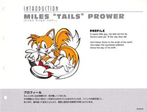 The character was originally developed under the name “Miles Prower”, a pun on “miles per hour“.[13]Tails Designer Shares Character's Origins 30 Years After Sonic The Hedgehog 2. Time Extension. . Archived version Accounts differ on exactly how the final name was settled. Yamaguchi stated that he had intended the character to be called Miles, while American staff preferred “Tails” and eventually reached a compromise in which “Miles Prower” became the character’s full name and “Tails” his nickname.[22]Yasushi Yamaguchi's explains Tails' creation on the 30th anniversary of Sonic 2. Twitter. [25]Al Nilsen on Twitter. Twitter. . Archived version[26]https://note.com/beep21/n/nc711d5372986 Later accounts have also credited artist Brenda Ross with suggesting “Miles Prower” during development, while Naka said in a 1993 interview that the nickname “Tails” may have come up during a meeting with an ABC producer connected to the early animated productions.[27]The People Making Sega's Future. Beep! Mega Drive. . pp. 46–48[28]https://segaretro.org/Interview:_Brenda_Cook_(2025-03-10)_by_Alexander_Rojas. [29]Ken Rose, email to Alexander Rojas, December 7, 2025: “One of my favorite STI memories is of how pleased with herself Brenda Ross was with the ‘Miles Prower’ name.”